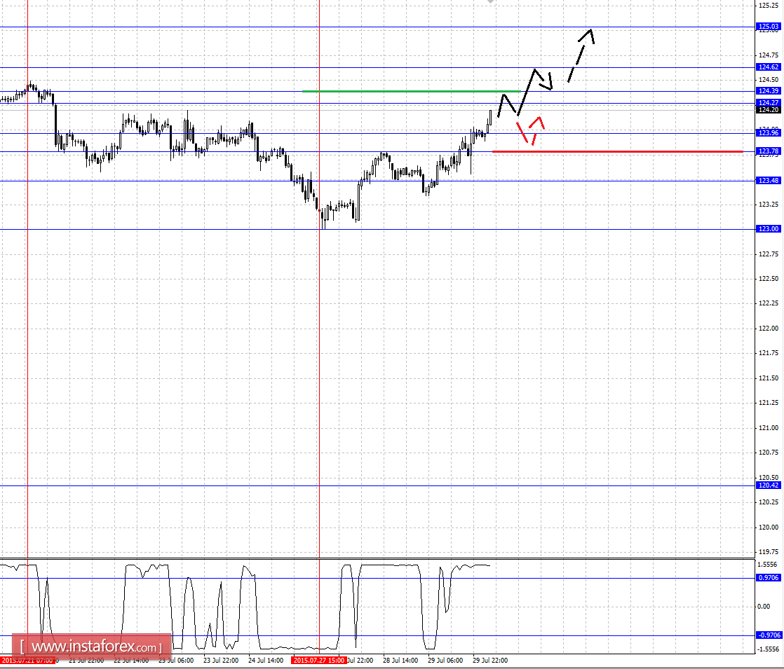 Краткосрочное нисходящее движение возможно в коридоре 123.96 - 123.78, пробой последнего значения приведет к углубленной коррекции, здесь цель - 123.48, этот уровень является ключевой поддержкой для восходящей структуры от 27 июля.