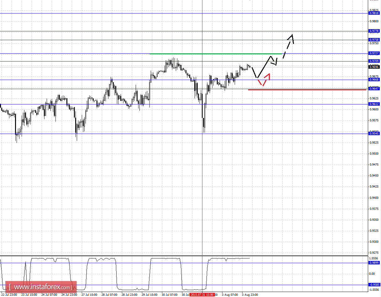 Краткосрочное нисходящее движение возможно в коридоре 0.9668 - 0.9647, пробой последнего значения приведет к углубленному движению, здесь цель - 0.9612, этот уровень является ключевой поддержкой для верха.