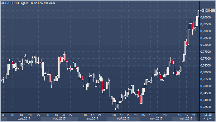 Австралийский доллар обновил двухлетние максимумы в паре с долларом США, протестировав сегодня в Азии уровень 0.8065. Рынок продолжает отыгрывать реакцию на итоги заседания Федерального комитета по открытым рынкам, продавая доллар по всему спектру рынка.