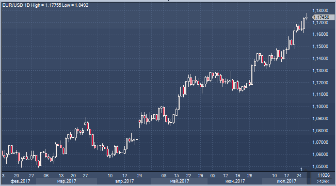 Интересно, что на прошлой неделе состоялось заседание ЕЦБ, который также постарался проявить максимум осторожности, обещая рынку стимулы отныне и во веки веков, пока инфляция не достигнет целевых уровней. И все же инвесторы рассчитывают на сокращение или постепенный выход европейского ЦБ из программы покупки активов, но не верят в дальнейшее ужесточение ФРС. С технической точки зрения, евро/доллар уже пробил верхнюю границу двухлетнего диапазона, которая проходит в области 1.1730. И если сейчас ему удастся закрепиться на новых позициях, цель на уровне 1.20 вполне реальной и достижимой уже в обозримом будущем.