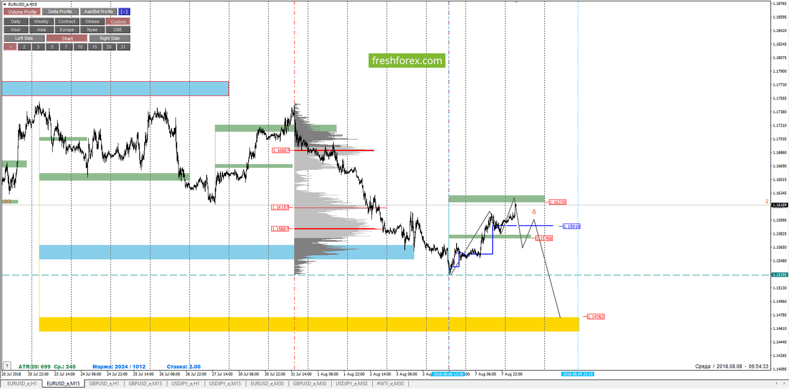 Среднесрочная тенденция: в шорт. Максимальное скопление объемов последнего импульса среднесрочного падения - 1.15887, 1.16157 и 1.16887 и в настоящий момент пара пробила некоторые из указанных скоплений, что указывает на слабость продавцов.