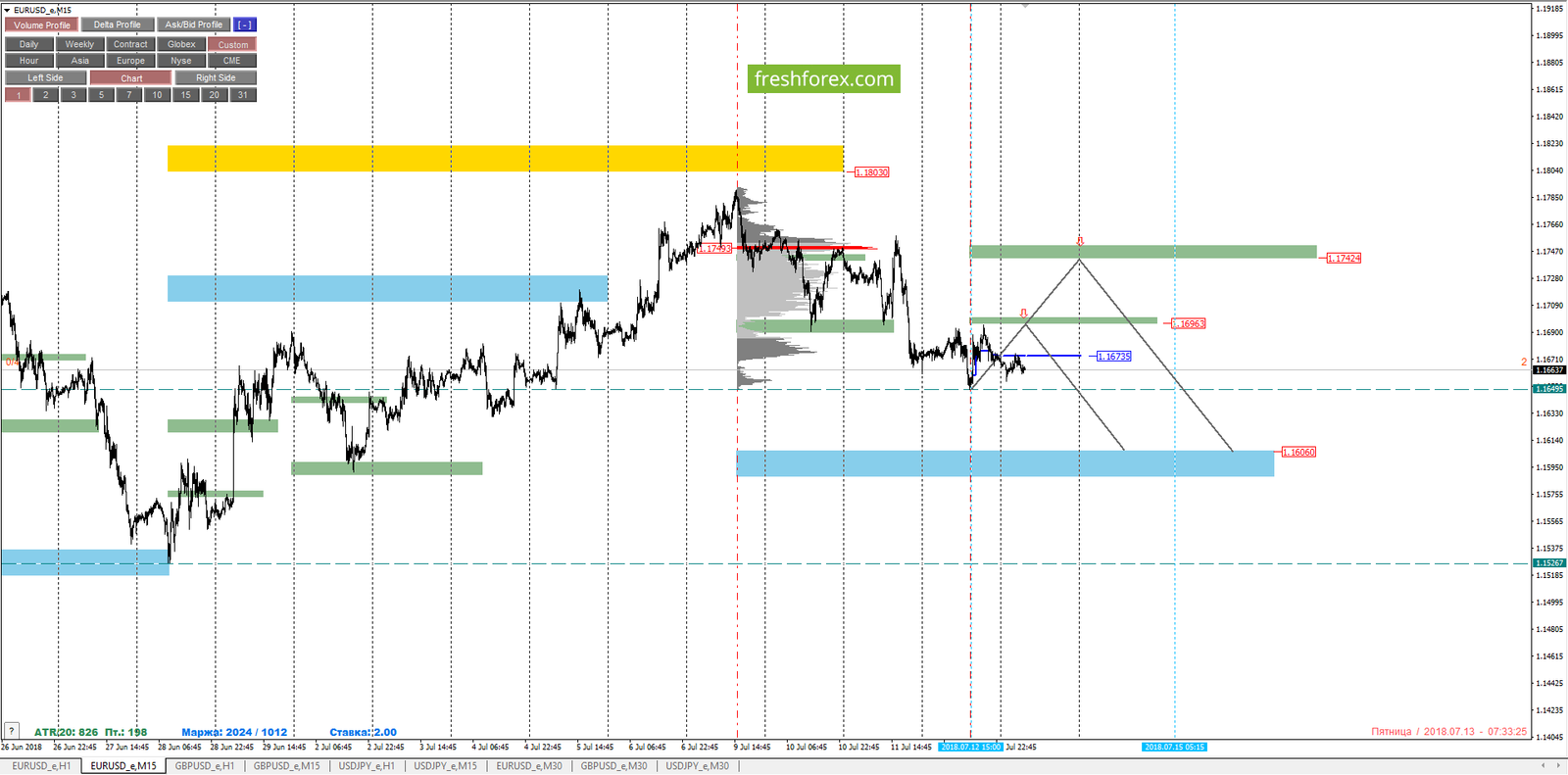 13 июля 2018, EUR/USD. EURUSD: удержание ранее открытых продаж. Новые продажи по среднесрочной тенденции.