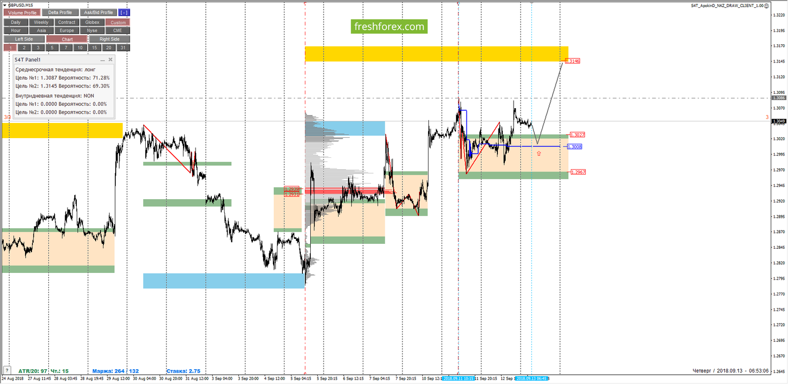 Внутридневные цели : обновление максимумов от 11.09.2018 (1.3086), среднесрочные цели: тест нижней границы ЗНКЗ – 1.3146.