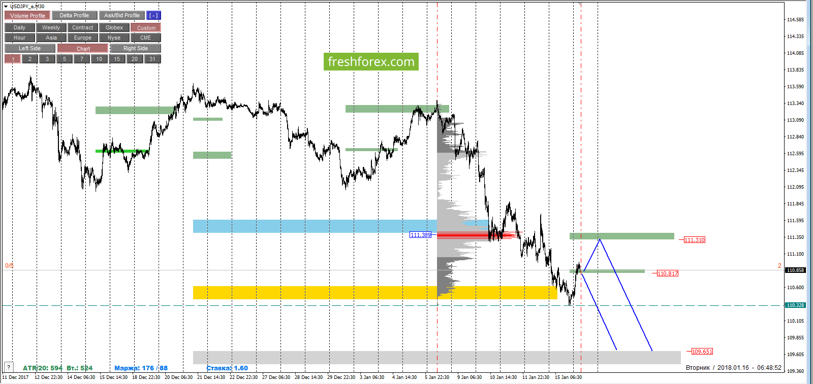 Котировка нижней границы зоны 1/4 - 110.817, котировка нижней границы зоны 1/2 - 111.310. Внутридневные цели на продажу: обновление минимумов от 15.01.2018- 110.328, среднесрочные цели: тест верхней границы СНКЗ построенной - 109.651.