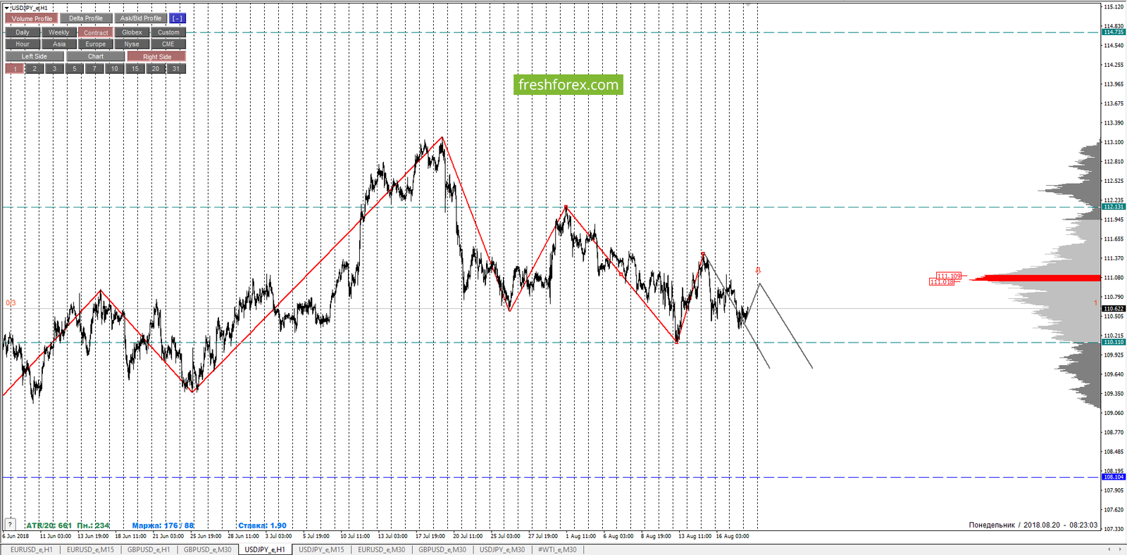 Максимальное скопление объемов шортового импульса расположено по котировке 110.914, а уровень DPOC предполагаемой коррекции – 110.871 и в настоящий момент торгуемся ниже уровня DPOC.