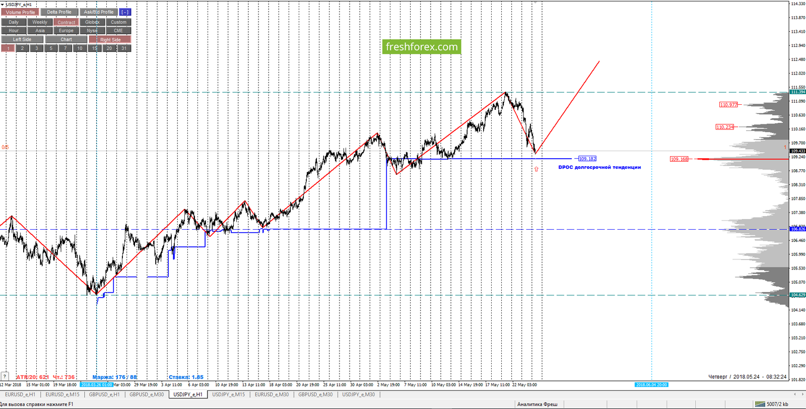 Внутридневные цели: обновление минимумов от 24.05.2018 (109.347), среднесрочные цели: тест верхней границы ЗНКЗ (108.499).