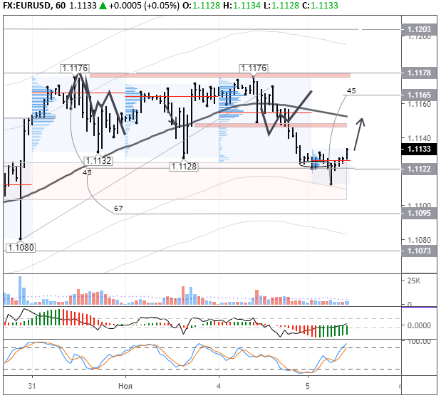 Цена поднялась выше 1,1130 (нижняя граница консолидации 31 октября-1 ноября). 45 градус расположен на 1,1165. Балансовая линия проходит через 1,1150. Ждем восстановления цены до 1,1150. Может реализоваться двойная вершина (H1,1180 от 21.10 и Н1,1176 от 4.11). Если цена поднимется выше 1,1150, то вчерашняя попытка развернуть рынок нивелируется.