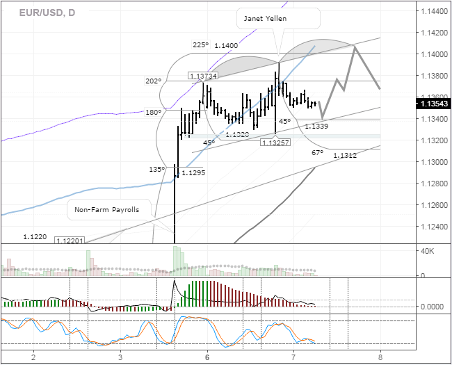 В начале её выступления курс евро/доллар упал до 1,1325. Затем около получаса пара торговалась на уровне 1,1360. Обновив дневной максимум, курс вернулся к уровню 1,1350.