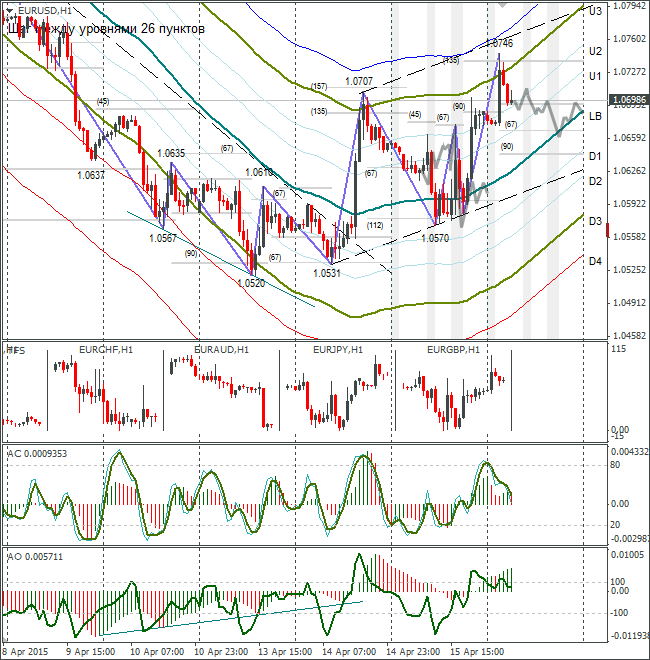 Обратите внимание на часовой график ниже. Рост был остановлен линией U3. Если ценовые уровни Ганна считать от минимумов, то цена останавливалась на 135-м градусе. Во вторник курс евро от U3 откатился до Lb. Рискну на четверг рассмотреть тоже откат к Lb.