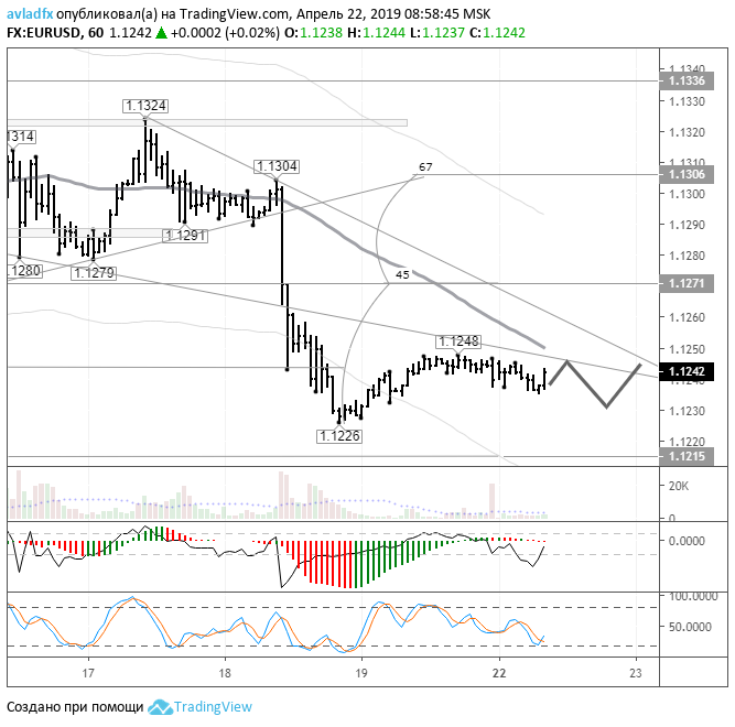 Из-за праздника активность на рынке низкая. Многие европейские страны по-прежнему остаются закрытыми в связи с празднованием Пасхи. Торговля ведется на пониженных объемах. На часовом периоде пара торгуется в нисходящем тренде. Соответственно сохраняются понижательные риски.