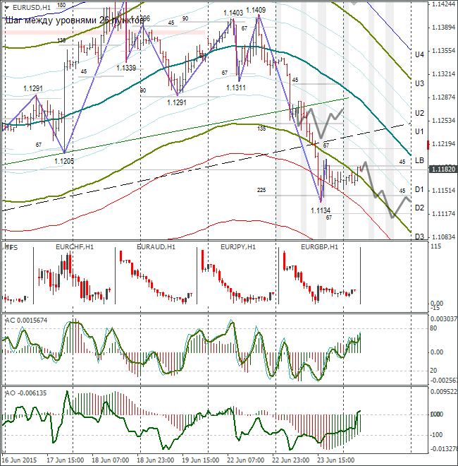 Падение евро остановилось ниже линии D4 на 225-м градусе. Сейчас пара торгуется по 1,1186 около линии D3 и 45-го градуса. После вчерашнего снижения надо бы рассмотреть восстановление EURUSD до линии lb, но сдаётся мне, что евро пойдёт ниже к 1,1115. Не хватает для коррекции бычьей дивергенции по АО. От 1,1115 жду отскок.