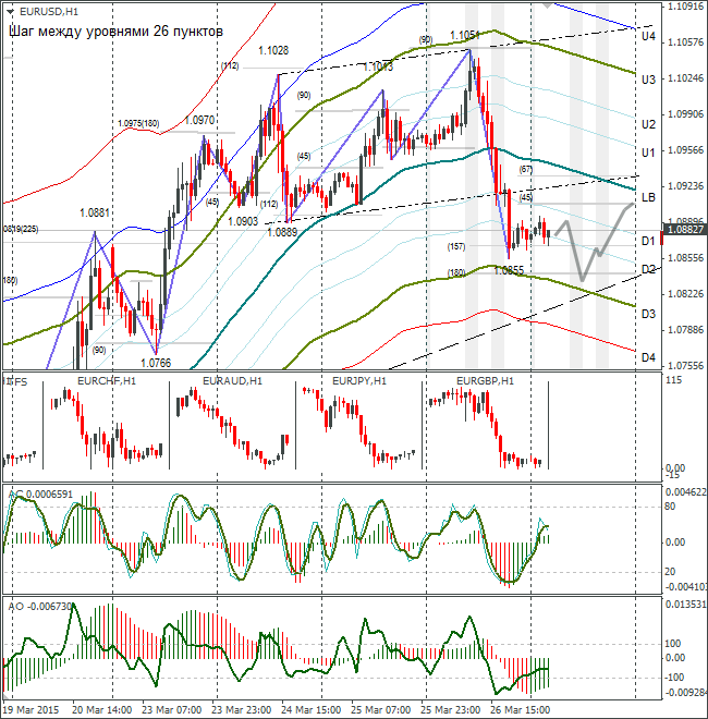 С максимума 1,1051 курс евро/доллар сначала снизился до 1,0917. После закрытия Европы под уровнем 1,0900 сработали защитные стопы. Евро направляется к линии D3. Моя цель на пятницу – 1,0855. Мишкам желательно закрыть месяц в районе 1,0700, иначе быки попытаются в апреле опять обновить максимум.