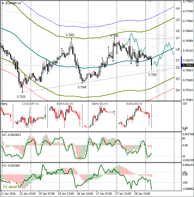 Мне нравится поведение кросса в последние пять дней, особенно чередование. Цена день растёт, день – снижается. После решения Банка Японии ввести отрицательные процентные ставки на излишние резервы банков, курс евро/фунт снижался до 0,7582. Цена срикошетила и сейчас находится на уровне 0,7612. По кроссу прослеживается треугольник, поэтому в пятницу жду от евро укрепление до 0,7657. Рост кросса положительно скажется на паре евро/доллар.