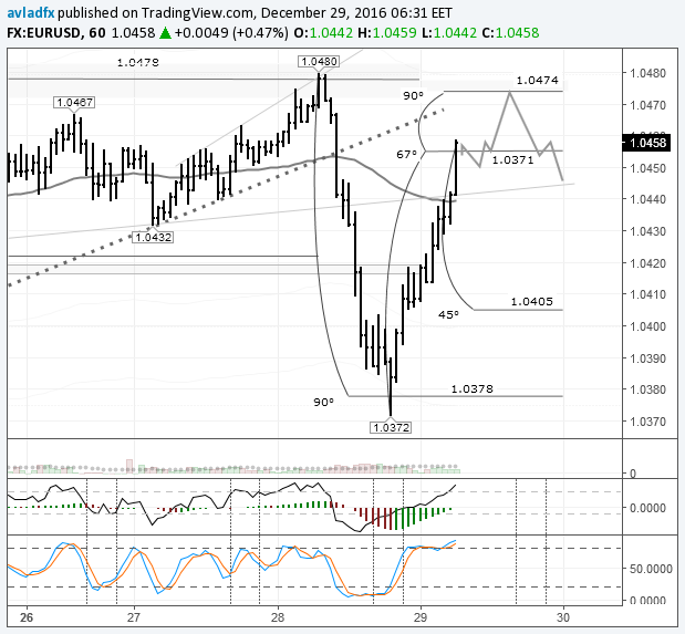 Объемы торговых операций на рынке форекс невысоки. Вчера евро упал на одну фигуру. Сегодня в Азии без труда почти всё отыграл. Цена восстановилась от минимума 1,0372 до 1,0458. Чем сильнее падение, тем резче коррекция. Я по прогнозу жду полного перекрытия вчерашнего падения. В среду курс снизился на 90 градусов. Тот же градус от минимума 1,0372 находится на уровне 1,0474. Вот от него возможна коррекция. Вряд ли евро остановится на текущем уровне 1,0458.