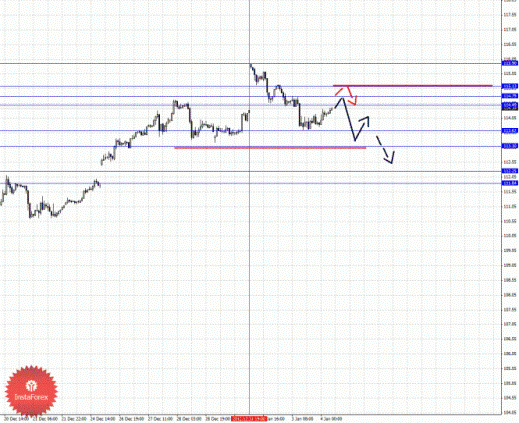 По паре Евро/Иена ключевыми уровнями являются: 115.90, 115.13, 114.79, 114.49, 113.62, 113.10, 112.25 и 111.84. Здесь нисходящую структуру от 31 декабря мы рассматриваем в качестве больших начальных условий для нисходящего цикла. Краткосрочное нисходящее движение ожидаем в коридоре 113.62 – 113.10, пробой последнего значения должен сопровождаться выраженным нисходящим движением, в данном случае цель 112.25. Потенциальным значением для низа считаем уровень 111.84, по достижении которого ожидаем консолидированное движение в коридоре 112.25 – 111.84. Краткосрочное восходящее движение возможно в коридоре 114.49 – 114.79, пробой последнего значения приведет к углубленному движению, здесь цель 115.13, от этого уровня высока вероятность разворота книзу, его пробой окажет негативное влияние на формирование начальных условий для нисходящего цикла, в данном случае потенциальная цель – 115.90.