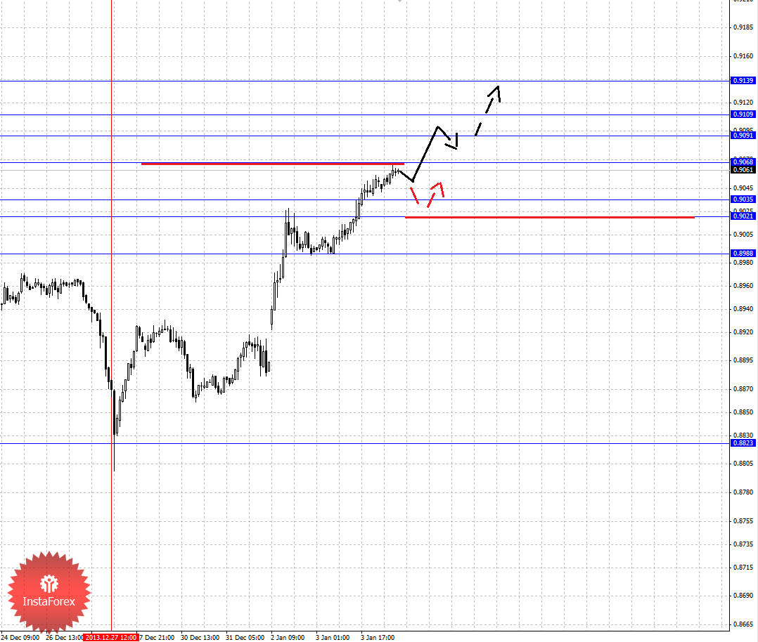По паре Доллар/Франк ключевым уровня являются: 0.9139, 0.9109, 0.9091, 0.9068, 0.9035, 0.9021 и 0.8988. Здесь продолжения развития восходящего цикла от 27 декабря ожидаем после пробоя 0.9068, в данном случае цель – 0.9091, в коридоре 0.9091 – 0.9109 консолидация цены. Потенциальным значением для верха считаем уровень – 0.9139, по достижении которого ожидаем откат книзу. Краткосрочное нисходящее движение возможно в коридоре 0.9035 – 0.9021, пробой последнего значения приведет к развитию углубленного движения, здесь цель – 0.8988.