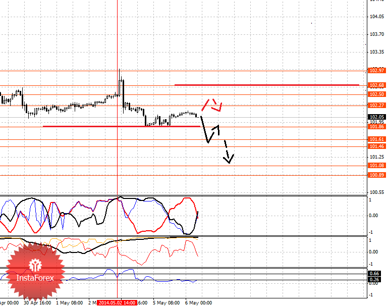 По паре Доллар/Иена ключевыми уровнями в масштабе Н1 являются: 102.97, 102.68, 102.50, 102.27, 101.86, 101.61, 101.46, 101.08 и 100.89. Здесь от 2 мая формируется потенциал для нисходящего движения, продолжения движения книзу ожидаем после пробоя 101.86, в данном случае цель – 101.61, проход ценой шумового диапазона 101.61 – 101.46 должен сопровождаться выраженным движением книзу, здесь цель – 101.08. Потенциальным значением для низа считаем уровень – 100.89, по достижении которого ожидаем откат кверху. Краткосрочное восходящее движение возможно в коридоре 102.27 – 102.50, отмены нисходящей структуры ожидаем после пробоя 102.68, здесь цель – 102.97.