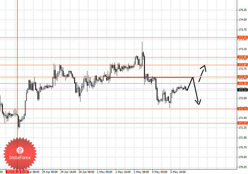 По паре Фунт/Иена ключевыми уровнями в масштабе Н1 являются: 173.55, 173.05, 172.85, 172.55, 172.38, 171.73 и 171.37. Здесь цена близка к отмене восходящей структуры от 28 апреля, продолжения движения к низу, ожидаем после пробоя 171.73, в данном случае первая цель – 171.37. Краткосрочное восходящее движение, возможно в диапазоне 172.38 – 172.55, пробой последнего значения будет располагать к развитию восходящего движения, в данном случае цель – 172.85, в коридоре 172.85 – 173.05 консолидация цены. Пробой уровня 173.05 должен сопровождаться выраженным восходящим движением, здесь потенциальная цель – 173.55.