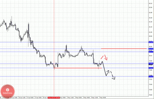 По паре Евро/Доллар следим за развитием нисходящего цикла от 1 мая, сегодня ожидаем выполнения коррекции кверху. По паре Доллар/Франк структура развивается аналогичным образом. По паре Фунт/Доллар продолжаем следить за нисходящей структурой от 30 апреля. По паре Доллар/Йена продолжения движения книзу ожидаем после пробоя 79.69. По паре Евро/Йена следим за нисходящим циклом от 20 апреля и здесь цена подходит к ключевым пределам для завершения восходящей структуры. По паре Фунт/Йена ключевые цели для низа определяем, исходя из локальной нисходящей структуры от 2 мая.