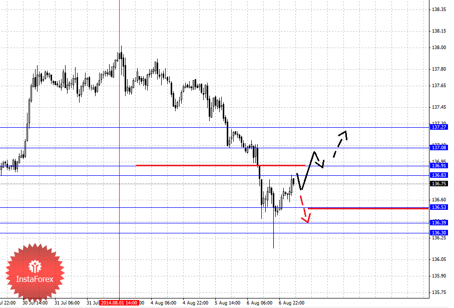 По паре Евро/Иена ключевыми уровнями в масштабе Н1 являются: 137.27, 137.08, 136.91, 136.83, 136.53, 136.39 и 136.30. Здесь мы ожидаем откат кверху от нисходящей структуры 1 августа. Развитие восходящей структуры ожидаем после прохода ценой шумового коридора 136.83 – 136.91, в данном случае цель – 137.08, возле этого уровня консолидация цены, отсюда также высока вероятность разворота книзу. Потенциальным значением для верха пока считаем уровень 137.27, до которого ожидаем оформления начальных условий. Продолжение движения книзу возможно после пробоя 136.53, здесь цель – 136.39.