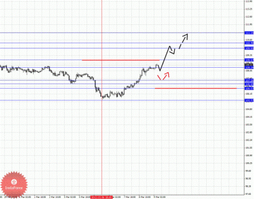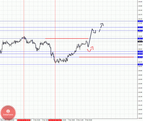 По паре Евро/Доллар следим за формированием начальных условий для восходящего цикла от 6 марта. По паре Доллар/Франк также следим за нисходящей структурой от 7 марта. По паре Фунт/Доллар от 7 марта наблюдается достаточно неплохой потенциал для движения кверху, однако нисходящая структура от 29 февраля здесь все еще актуальна. По паре Доллар/Йена следим за локальной восходящей структурой от 7 марта. По паре Евро/Йена следим за развитием восходящей структуры от 6 марта. По паре Фунт/Йена развития восходящей тенденции ожидаем после пробоя 129.72.