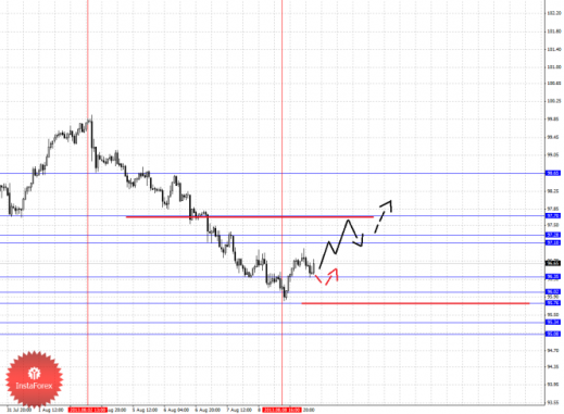 По паре Доллар/Иена ключевыми уровнями являются: 98.65, 97.70, 97.28, 97.10, 96.35, 96.02, 95.76, 95.34 и 95.08. Здесь от 8 августа формируется потенциал для развития восходящей коррекции. Продолжения движения кверху ожидаем после прохода ценой шумового диапазона 97.10–97.28, в данном случае цель 97.70, от этого уровня возможен ключевой разворот книзу, его проход ценой будет располагать к формированию восходящей тенденции в масштабе Н1, в данном случае потенциальная цель – 98.65. Краткосрочное нисходящее движение возможно после пробоя 96.35, здесь цель 96.02, проход ценой шумового диапазона 96.02–95.76 продолжит развитие нисходящей структуры от 2 августа, в данном случае цель 95.34. Потенциальным значением для низа считаем уровень 95.08, из диапазона 95.34–95.08 существует высокая вероятность разворота кверху.