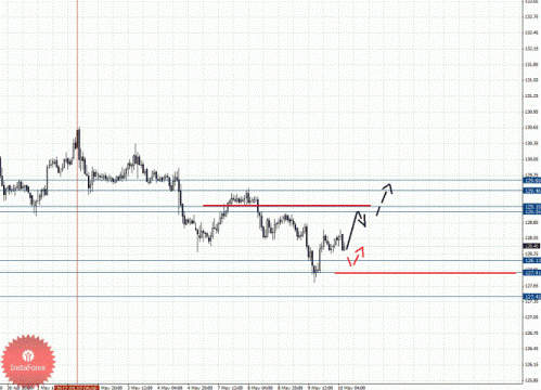 По паре Фунт/Йена ключевыми уровнями являются: 129.66, 129.46, 129.16, 129.06, 128.46, 128.13, 127.91 и 127.45. Здесь основные цели остались практически без изменения, однако стратегия сместилась в сторону восходящего движения. Краткосрочное нисходящее движения ожидаем в коридоре 128.13 – 127.91, пробой последнего значения позволит рассчитывать на движение к потенциальной цели – 127.45, по достижении которого ожидаем откат кверху. Диапазон 129.06 – 129.16 является ключевой поддержкой для нисходящей структуры, проход его ценой будет располагать к развитию восходящей тенденции, в данном случае первая цель 129.46. Потенциальным значением для верха считаем уровень 129.66, по достижении которого ожидаем консолидацию в коридоре 129.46 – 129.66.