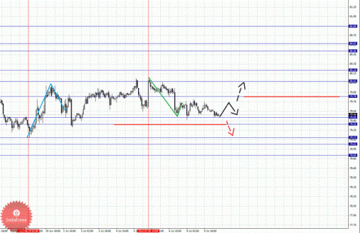 По паре Доллар/Иена ключевыми уровнями являются: 80.89, 80.62, 80.50, 80.20, 80.03, 79.78, 79.45, 79.35, 79.13, 79.03 и 78.85. Здесь нисходящую структуру от 5 июля мы рассматриваем в качестве потенциальных начальных условий для движения книзу. Краткосрочное нисходящее движени возможно в коридоре 79.45 – 79.35, пробой последнего значения, должен сопровождаться выраженным нисходящим движением к уровню 79.13, в коридоре 79.13 – 79.03 консолидация цены. Потенциальным значением для низа считаем уровень 78.85, по достижении которого ожидаем откат кверху. Уровень 79.78 является ключевым сопротивлением для развития восходящей структуры от 29 июня, его пробой позволит рассчитывать на движение к первой цели – 80.03.