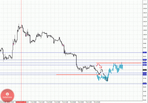 По паре Фунт/Иена ключевыми уровнями являются: 124.20, 123.71, 123.42, 122.88, 122.63, 122.26, 122.13 и 121.54. Здесь мы продолжаем следить за нисходящей структурой от 3 июля. Краткосрочное нисходящее движение ожидаем в коридоре 122.88 – 122.63, пробой последнего значения должен сопровождаться выраженным нисходящим движением, в данном случае цель 122.26, в коридоре 122.26 – 122.13 консолидация цены. Потенциальным значением для низа считаем уровень 121.54, движение к которому ожидаем после пробоя 122.10. Краткосрочное восходящее движение возможно в диапазоне 123.42 – 123.71, пробой последнего значения будет располагать к формированию восходящей структуры, здесь потенциальная цель – 124.20.