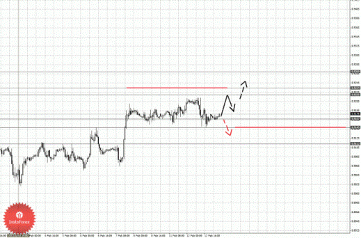 По паре Доллар/Иена ключевыми уровнями являются: 95.07, 94.47, 93.93, 93.69, 92.87, 92.61, 92.09, 91.84 и 91.39. Здесь от 11 февраля формируется потенциал для развития нисходящего движения. Краткосрочное нисходящее движение ожидаем в коридоре 92.87 – 92.61, пробой последнего значения должен сопровождаться импульсивным движением к уровню 92.09, в коридоре 92.09 – 91.84 консолидация цены. Потенциальным значением для низа считаем уровень 91.39, по достижении которого ожидаем откат кверху. Краткосрочное восходящее движение возможно в коридоре 93.69 – 93.93, пробой последнего значения будет располагать к развитию восходящей структуры, в данном случае первая цель 94.47. Потенциальным значением для верха считаем уровень 95.07.