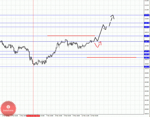 По паре Евро/Йена ключевыми уровнями являются: 111.25, 110.40, 109.95, 108.97, 108.34, 107.26, 106.94, 106.57 и 105.57. Здесь ключевые цели остались без изменения, и мы продолжаем следить за формированием восходящей структуры от 6 марта. В коридоре 108.34 – 108.97 ожидаем консолидированное движение, пробой уровня 108.97 должен сопровождаться импульсивным движением к уровню 109.95. В коридоре 109.95 – 110.40 консолидация цены. Потенциальным значением для верха считаем уровень 111.25, движение к которому ожидаем после пробоя 110.40. Корректировочное нисходящее движение возможно в диапазоне 107.26 – 106.94, пробой последнего значения приведет к углубленной коррекции, здесь цель 106.57, от этого уровня высока вероятность разворота кверху, его пробой приведет к отмене восходящей структуры от 6 марта, в данном случае цель – 105.57.