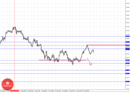 По паре Евро/Иена ключевыми уровнями являются: 130.87, 130.31, 129.98, 129.66, 128.47, 128.14, 127.46, 127.13 и 126.31. Здесь мы продолжаем следить за локальной нисходящей структурой от 2 августа. Краткосрочное нисходящее движение ожидаем в коридоре 128.47– 128.14, пробой последнего значения должен сопровождаться выраженным нисходящим движением, в данном случае цель 127.46, в коридоре 127.46–127.13 консолидация цены. Потенциальным значением для низа считаем уровень 126.31, движение к которому ожидаем после пробоя 127.10. Краткосрочное восходящее движение возможно в коридоре 129.66–129.98, пробой последнего значения приведет к углубленному движению, здесь цель 130.31, от этого уровня мы ожидаем последний ключевой разворот книзу, его проход ценой будет располагать к развитию восходящей структуры, в данном случае потенциальная цель – 130.87.