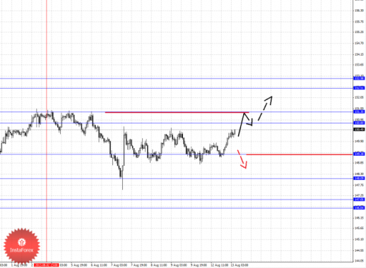 По паре Евро/Доллар для продолжения развития восходящей тенденции в масштабе Н1 необходимо создание локальной структуры. По паре Доллар/Франк развития восходящей структуры от 8 августа ожидаем после пробоя 0.9290. По паре Фунт/Доллар пока не наблюдаем выраженных начальных условий для нисходящего движения, их формирования ожидаем до уровня 1.5383. По паре Доллар/Иена продолжаем следить за восходящей корректировочной структурой от 8 августа. По паре Фунт/Иена цена близка к отмене нисходящей структуры от 2 августа, чего ожидаем после пробоя 150.80. По паре Евро/Иена ситуация пока остается без изменения, однако необходимо следить за корреляцией с другими валютами.
