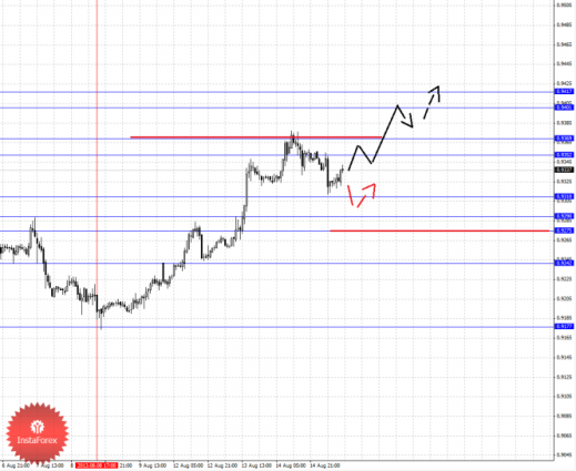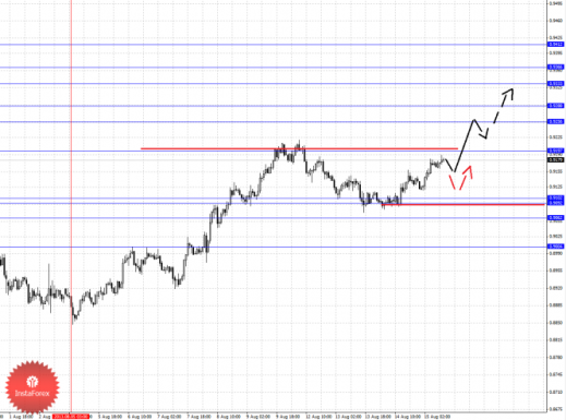 По паре Австралийский доллар/Доллар ключевыми уровнями являются: 0.9412, 0.9366, 0.9333, 0.9288, 0.9256, 0.9197, 0.9102, 0.9092, 0.9062 и 0.9004. Здесь продолжения развития восходящей структуры от 5 августа ожидаем после пробоя 0.9197, в данном случае первая цель 0.9256, далее уровни для верха остались без изменения. Развитие нисходящей тенденции, ожидаем после прохода ценой шумового диапазона 0.9102–0.9092, в данном случае цель 0.9062, возле этого уровня консолидация цены. Потенциальным значением для низа считаем уровень 0.9004, движение к которому ожидаем после пробоя 0.9060.