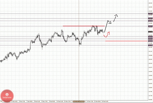 По паре Фунт/Йена ключевыми уровнями являются: 124.44, 124.03, 123.80, 123.34, 122.43, 122.25, 122.05 и 121.68. Здесь мы продолжаем следить за локальной восходящей структурой от 14 февраля. Продолжение движения кверху ожидаем после пробоя 123.35, в данном случае цель – 123.80, в коридоре 123.80 – 124.03 консолидация цены. Потенциальным значением для верха считаем уровень 124.44, движение к которому ожидаем после пробоя 124.05. Корректировочное нисходящее движение возможно в коридоре 122.43 – 122.25, пробой последнего значения приведет к углубленной коррекции, здесь цель 122.05, от этого уровня высока вероятность разворота кверху, его пробой приведет к отмене развития восходящей структуры от 14 февраля, здесь первая цель 121.68.