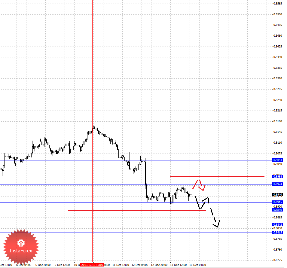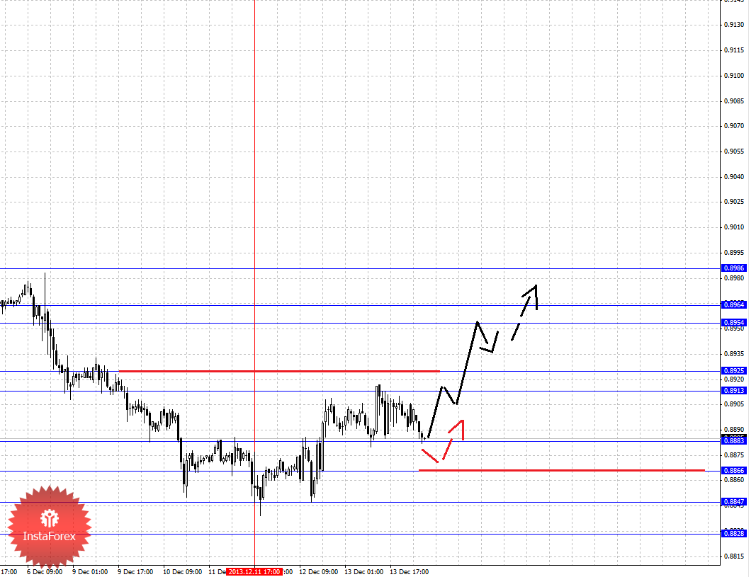 По паре Доллар/Франк ключевым уровня являются: 0.8986, 0.8964, 0.8954, 0.8925, 0.8913, 0.8883, 0.8866, 0.8847 и 0.8828. Здесь развития восходящей структуры от 11 декабря ожидаем после прохода ценой шумового диапазона 0.8913 – 0.8925, в данном случае цель – 0.8954, в коридоре 0.8954 – 0.8964 консолидация цены. Потенциальным значением для верха считаем уровень 0.8986, по достижении которого ожидаем откат книзу. Краткосрочное нисходящее движение возможно в коридоре 0.8883 – 0.8866, пробой последнего значения будет располагать к развитию нисходящей структуры, в данном случае цель – 0.8847. Потенциальным значением для низа пока считаем уровень – 0.8828.