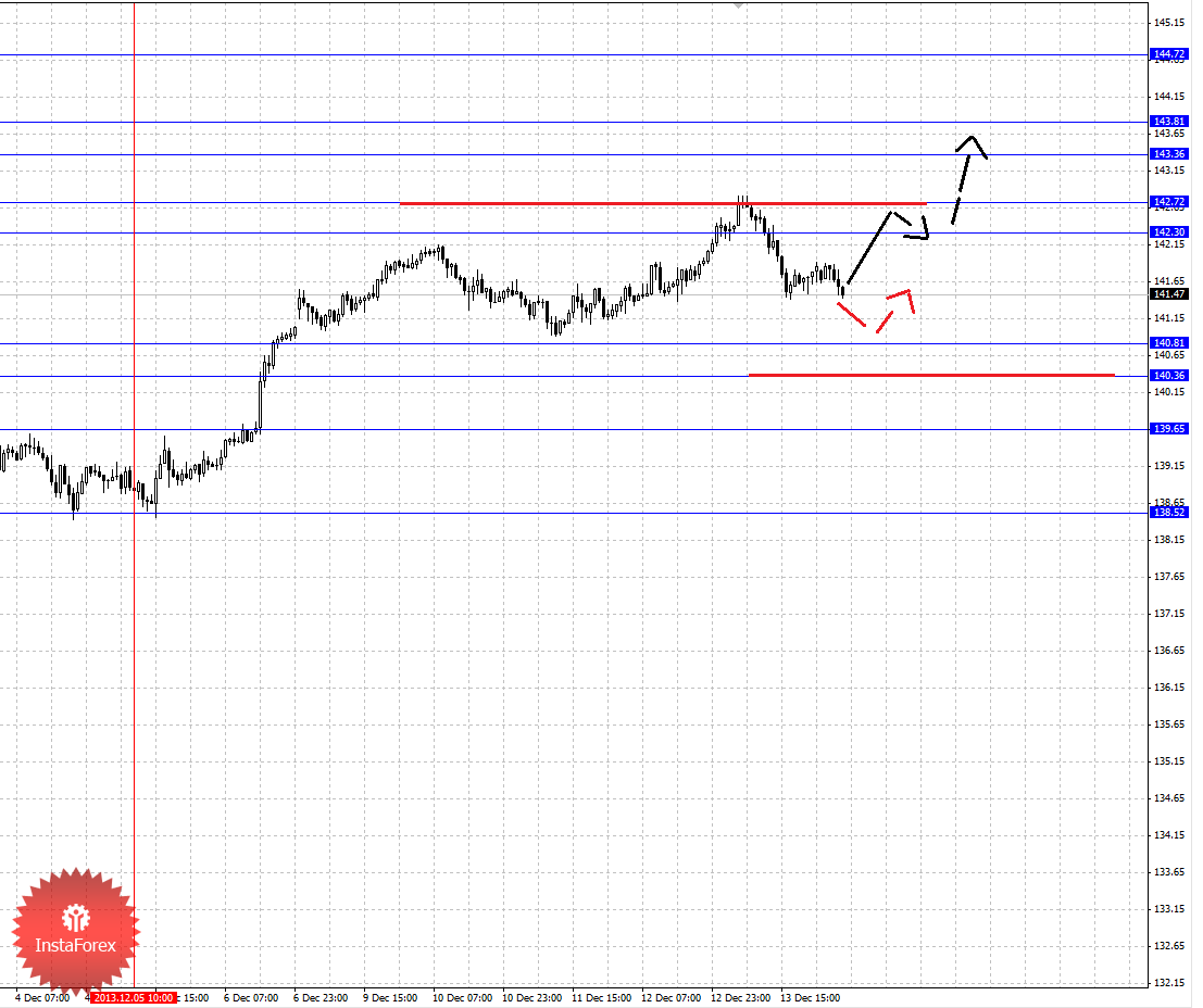 По паре Доллар/Иена ключевыми уровнями являются: 104.95, 104.42, 104.19, 103.58, 103.34, 102.77, 102.62, 102.41, 102.27 и 101.98. Здесь от 13 декабря формируется небольшой потенциал для нисходящего движения, развитие которого ожидаем после прохода ценой шумового диапазона 102.77 – 102.62, здесь цель - 102.41, в коридоре 102.41 – 102.27 консолидация цены. Потенциальным значением для низа считаем уровень 101.98, по достижении которого ожидаем откат кверху. Краткосрочное восходящее движение возможно в коридоре 103.34 – 103.58, пробой последнего значения продолжит развитие восходящей тенденции в масштабе Н1, в данном случае первая цель – 104.19.