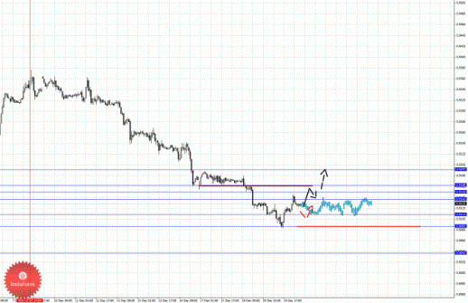 По паре Доллар/Канадский доллар ключевыми уровнями являются: 0.9939, 0.9923, 0.9913, 0.9894, 0.9876, 0.9868 и 0.9848. Здесь следим за развитием восходящей структуры от 13 декабря. Продолжения движения кверху ожидаем после пробоя 0.9894, в данном случае цель 0.9913, в коридоре 0.9913 – 0.9923 консолидация цены. Потенциальным значением для верха считаем уровень 0.9939, по достижении которого ожидаем откат книзу. Краткосрочное нисходящее движение возможно в коридоре 0.9876 -–0.9868, этот диапазон является ключевой поддержкой для восходящей структуры, отсюда высока вероятность разворота кверху. Пробой уровня 0.9868 окажет негативное влияние на последующее развитие восходящей структуры от 13 декабря, в данном случае потенциальная цель 0.9848.