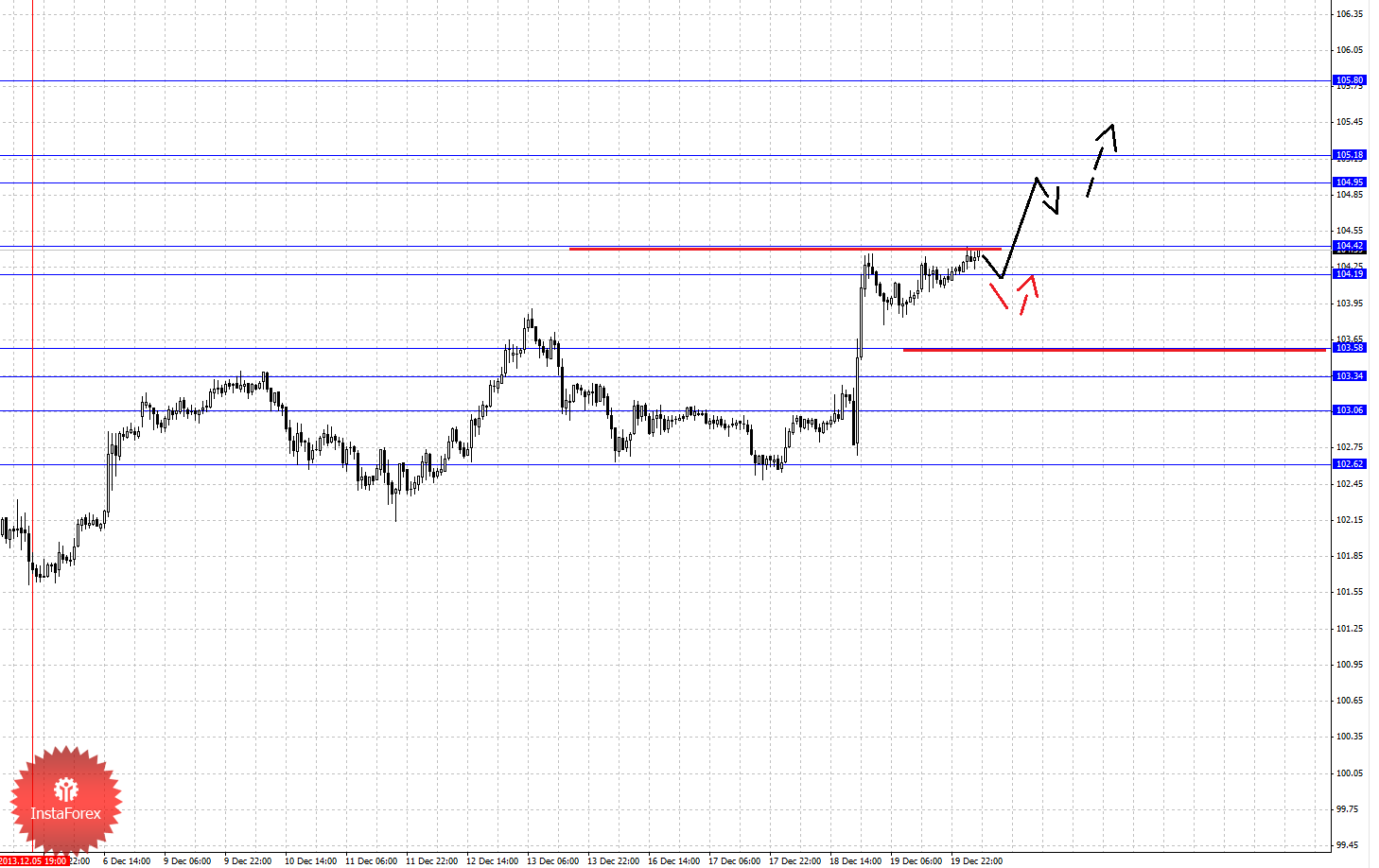 По паре Евро/Доллар продолжаем следить за нисходящей структурой от 11 декабря. По паре Доллар/Франк восходящую структуру от 17 декабря рассматриваем в качестве среднесрочных начальных условий. По паре Фунт/Доллар от 17 декабря формируется потенциал для развития восходящего цикла. По паре Доллар/Иена продолжения движения кверху ожидаем после пробоя 104.42. По паре Евро/Иена и Фунт/Иена ключевые цели остались без изменения.