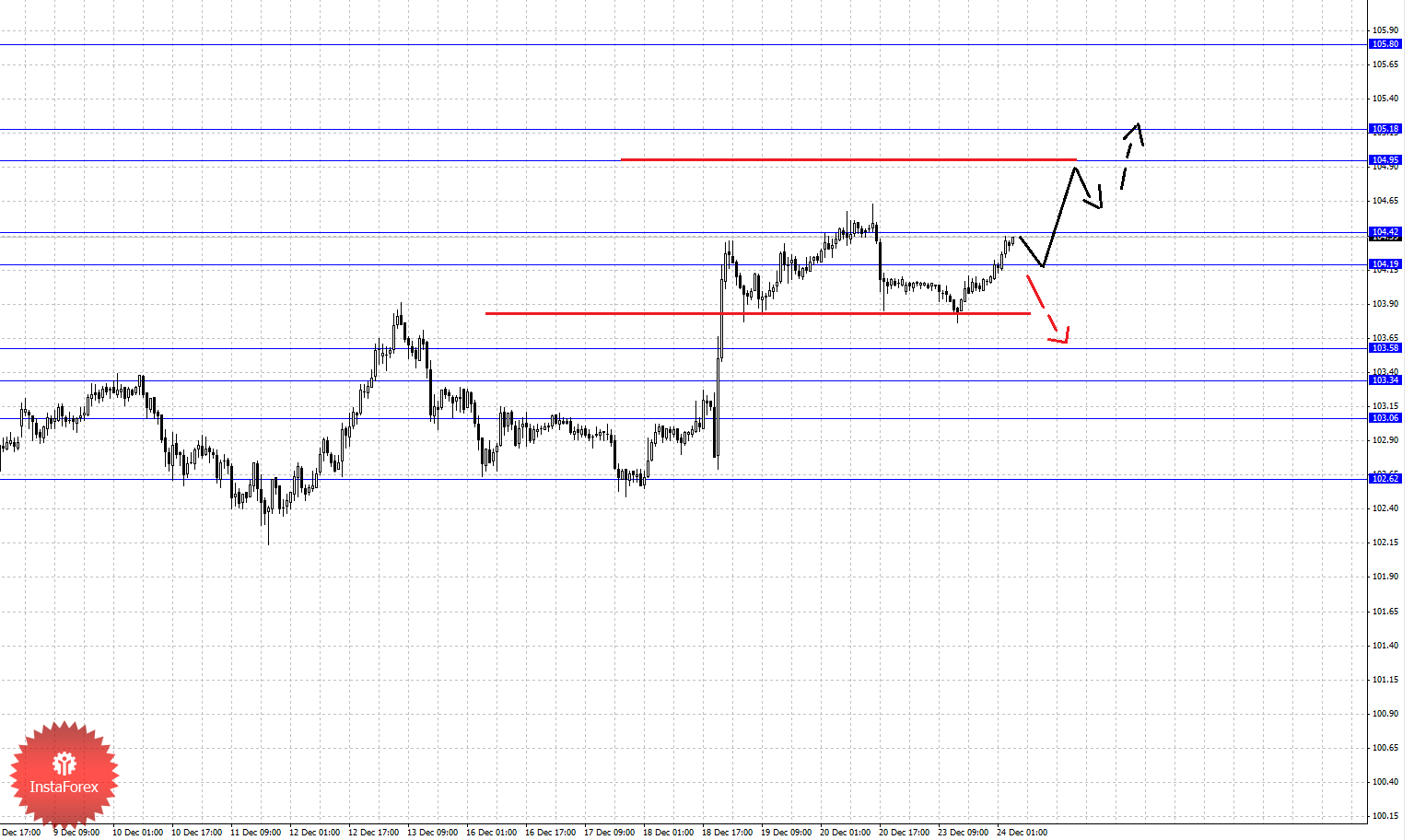 По паре Евро/Доллар от 20 декабря продолжает формироваться потенциал для восходящего движения, на текущий момент цена находится в корректировочной зоне. По паре Доллар/Франк продолжения движения кверху ожидаем после пробоя 0.8970. По паре Фунт/Доллар следим за формированием начальных условий для верха от 17 декабря. По паре Доллар/Иена продолжения движения кверху ожидаем после пробоя 104.42, начальных условий для нисходящего движения пока не наблюдается. По паре Евро/Иена потенциальным значением для верха является уровень – 143.36. По паре Фунт/Иена ключевые цели пока остались без изменения.