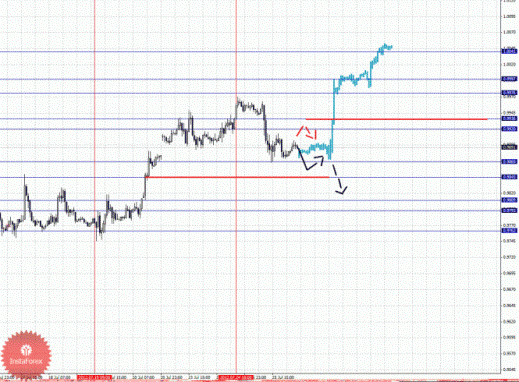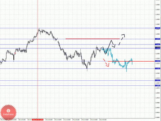 По паре Доллар/Франк ключевым уровня являются: 1.0041, 0.9997, 0.9976, 0.9936, 0.9920, 0.9869, 0.9845, 0.9809, 0.9793 и 0.9762. Здесь от 24 июля формируется потенциал для развития нисходящего цикла. Краткосрочное нисходящее движение ожидаем в диапазоне 0.9869 – 0.9845, пробой последнего значения должен сопровождаться выраженным нисходящим движением к уровню 0.9809, в коридоре 0.9809 – 0.9793 консолидация цены. Потенциальным значением для низа считаем уровень 0.9762, по достижении которого ожидаем откат кверху. Краткосрочное восходящее движение ожидаем в коридоре 0.9920 – 0.9936, проход ценой данного диапазона приведет к последующему развитию восходящей тенденции от 19 июля, в данном случае первая цель – 0.9976.