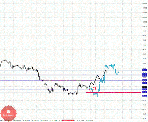 По паре Евро/Иена ключевыми уровнями являются: 96.34, 96.00, 95.84, 95.44, 95.20, 94.65, 94.40 и 94.07. Здесь мы следим за формированием потенциала для развития восходящей структуры от 24 июля. Краткосрочное восходящее движение возможно в коридоре 95.20 – 95.44, пробой последнего значения должен сопровождаться выраженным восходящим движением, в данном случае цель 95.84, в коридоре 95.84 – 96.00 консолидация цены. Потенциальным значением для верха считаем уровень 96.34, по достижении которого ожидаем откат книзу. Краткосрочное нисходящее движение возможно в диапазоне 94.65 – 94.40, пробой последнего значения приведет к отмене восходящей структуры от 24 июля, в данном случае первая цель 94.07.