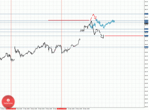 По паре Евро/Доллар важными уровнями являются: 1.3347, 1.3314, 1.3302, 1.3284, 1.3275, 1.3233, 1.3221, 1.3191, 1.3174 и 1.3122. Здесь от 21 декабря формируется потенциал для развития восходящего движения. Продолжения развития восходящей структуры от 21 декабря ожидаем после прохода ценой шумового диапазона 1.3275 – 1.3284, в данном случае цель 1.3302, в коридоре 1.3302 – 1.3314 консолидация цены. Потенциальным значением для верха считаем уровень 1.3347, по достижении которого ожидаем откат книзу. Диапазон 1.3233 – 1.3221 является ключевой поддержкой для восходящей структуры, его пробой приведет к движению до 1.3191. Из коридор 1.3191 – 1.3174 мы ожидаем последний разворот кверху, пробой уровня 1.3174 будет располагать к развитию нисходящей структуры, в данном случае потенциальная цель – 1.3122.