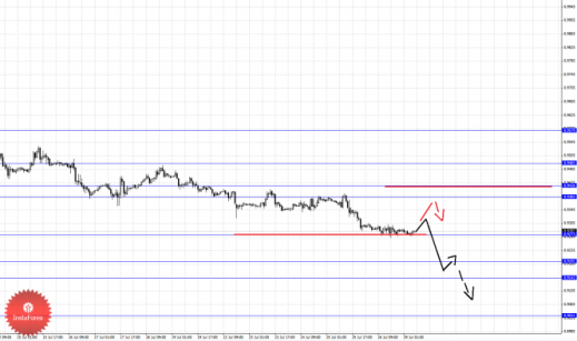 По паре Фунт/Иена ключевыми уровнями являются: 152.18, 151.77, 151.51, 150.27, 149.98, 149.30, 148.97 и 148.47. Здесь мы продолжаем следить за нисходящим циклом от 24 июля. Краткосрочное нисходящее движение возможно в коридоре 150.27–149.98, пробой последнего значения должен сопровождаться выраженным нисходящим движением, в данном случае цель 149.30, в коридоре 149.30–148.97 консолидация цены. Потенциальным значением для низа считаем уровень 148.47, по достижении которого ожидаем откат кверху. Краткосрочное восходящее движение возможно в коридоре 151.51–151.77, пробой последнего значения приведет к углубленному движению, здесь цель 152.18, до этого уровня ожидаем оформления начальных условий для восходящего цикла.