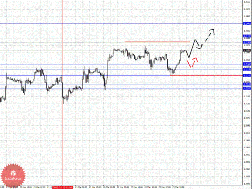 По паре Фунт/Йена ключевыми уровнями являются: 133.34, 132.44, 131.89, 130.46, 130.22, 139.63, 129.26 и 128.57. Здесь мы следим за формированием нисходящей структуры от 27 марта. Продолжения движения книзу ожидаем после прохода ценой шумового диапазона 130.46 – 130.22, в данном случае цель 129.63, в коридоре 129.63 – 129.26 консолидация цены. Потенциальным значением для низа считаем уровень 128.57, по достижении которого, ожидаем откат кверху. Краткосрочное восходящее движение возможно в коридоре 131.89 – 132.44, пробой последнего значения приведет к отмене нисходящей структуры от 27 марта, в данном случае потенциальная цель 133.34.