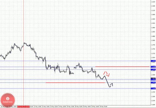 По паре Доллар/Канадский доллар ключевыми уровнями являются: 1.0322, 1.0297, 1.0280, 1.0221, 1.0206, 1.0174, 1.0162 и 1.0137. Здесь от 25 мая формируются потенциальные начальные условия для развития нисходящего движения. Краткосрочное движение книзу ожидаем в коридоре 1.0221 – 1.0206, пробой последнего значения должен сопровождаться импульсивным движением к уровню 1.0174, в коридоре 1.0174 – 1.0162 консолидация цены. Потенциальным значением для низа считаем уровень 1.0137, по достижении которого ожидаем откат кверху. Краткосрочное восходящее движение возможно в коридоре 1.0280 – 1.0297, пробой последнего значения приведет к отмене нисходящей структуры от 25 мая, в данном случае первая цель 1.0322.