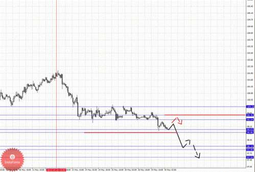По паре Евро/Доллар и Доллар/Франк мы пока не наблюдаем каких-либо начальных условий для противоположного движения, однако ситуация по паре Доллар/Канадский доллар сохраняет свою актуальность и мы рекомендуем обратить на это внимание. По паре Фунт/Доллар продолжаем следить за нисходящим движением, начальных условий для верха здесь не создано. По паре Доллар/Йена цена зашла в продолжительный горизонтальный коридор. По паре Евро/Йена следим за нисходящей структурой от 22 мая. По паре Фунт/Йена ожидаем выхода цены из зоны начальных условий в нисходящем направлении.