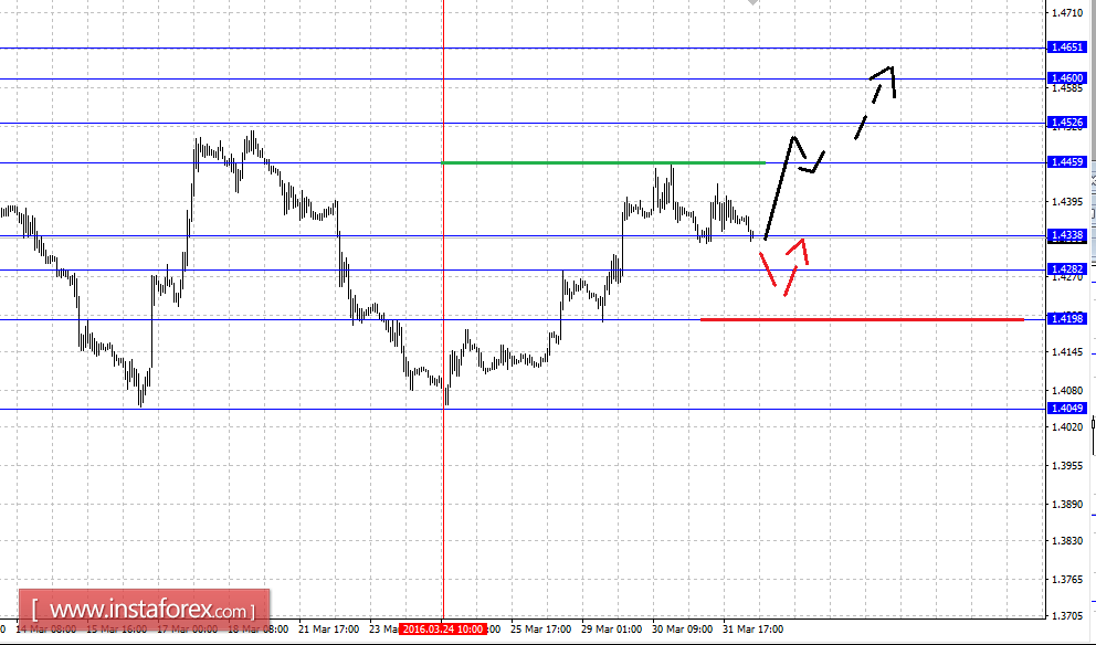 Краткосрочное нисходящее движение возможно в коридоре 1.4338 – 1.4282, пробой последнего значения приведет к углубленной коррекции, здесь цель – 1.4198, этот уровень является ключевой поддержкой для верха.