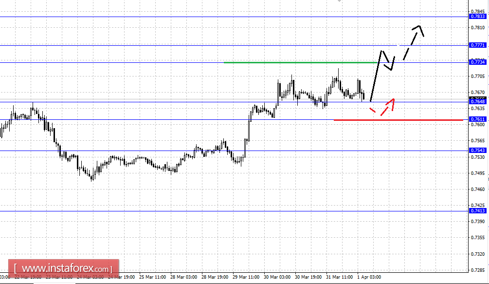 Краткосрочное нисходящее движение возможно в коридоре 0.7648 – 0.7611, пробой последнего значения приведет к углубленной коррекции, здесь цель – 0.7543.