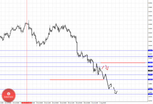 По паре Австралийский доллар/Доллар ключевыми уровнями являются: 0.9101, 0.9058, 0.9016, 0.8987, 0.8931, 0.8895, 0.8826 и 0.8793. Здесь мы продолжаем следить за нисходящим циклом от 24 июля. Краткосрочное нисходящее движение возможно в коридоре 0.8931–0.8895, пробой последнего значения приведет к выраженному развитию нисходящей тенденции, в данном случае цель – 0.8826. Потенциальным значением для низа считаем уровень 0.8793, по достижении которого ожидаем консолидацию. Краткосрочное восходящее движение возможно в коридоре 0.8987–0.9016, пробой последнего значения приведет к развитию углубленной коррекции, в данном случае цель 0.9058. Потенциальным значением для верха считаем уровень 0.9101, до которого ожидаем оформления начальных условий для последующего развития восходящего цикла.